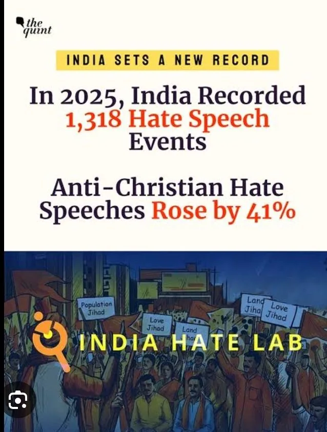 In January 2026, India Hate Lab reported that 1,318 hate speech events targeting religious minorities occurred in India during 2025 — a 13 percent increase from 2024 and nearly double that of 2023. Most instances were documented against Muslims, with a significant rise in anti-Christian hate speech as well. The data showed such events took place across multiple states and in various settings including political rallies, religious processions, and public gatherings. Critics and rights organisations cited this trend as evidence of growing intolerance and community tensions.