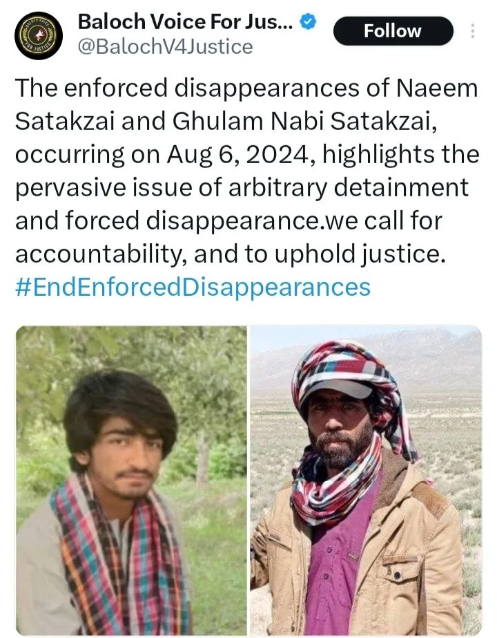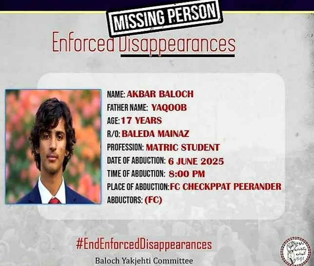 مکمل لاگ پڑھیںاکبر المعروف طاہر بلوچ کو بلوچ یکجہتی کمیٹی نے 7 جون 2025 کی شام 8 بجے غائب ہونے کے بعد مسنگ پرسن قرار دیا اور اغواء کا الزام (ایف سی) پر لگایا حالانکہ 8 فروری 2026 کی صبح پاکستانی سیکورٹی فورسز نے زم...