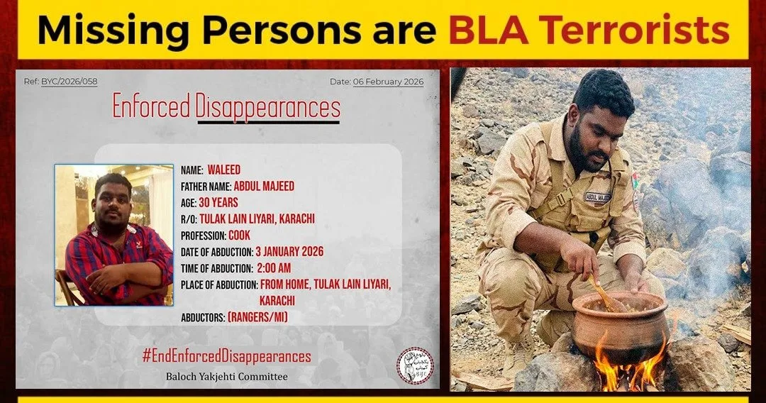 مکمل لاگ پڑھیںبلوچ یکجہتی کمیٹی (BYC) نے دعوی کیا کہ ولید ولد عبدالمجید کو 3 جنوری 2026ء کو سیکیورٹی فورسز نے کراچی لیاری سے اغوا کر لیا ہے۔ اسکو مسنگ پرسن قرار دے دیا گیا۔ پھر اسی ولید کی پہاڑوں میں کھانا پکاتے ت...