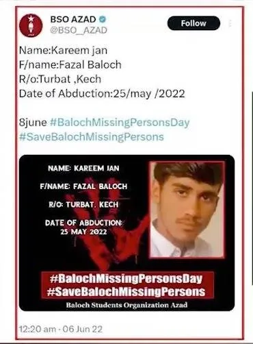 مکمل لاگ پڑھیںایمان مزاری نے اگست 2023 میں سالم کیلئے ٹویٹ کی تھی اور ڈی جی آئی ایس پی آر سے جواب مانگا تھا کہ سالم کہاں ہے ۔ اس کے بعد ماہرنگ بلوچ اور اسکی تنظیم بی وائی سی بھی سالم بلوچ کو مسنگ پرسن قرار دے کر اس...